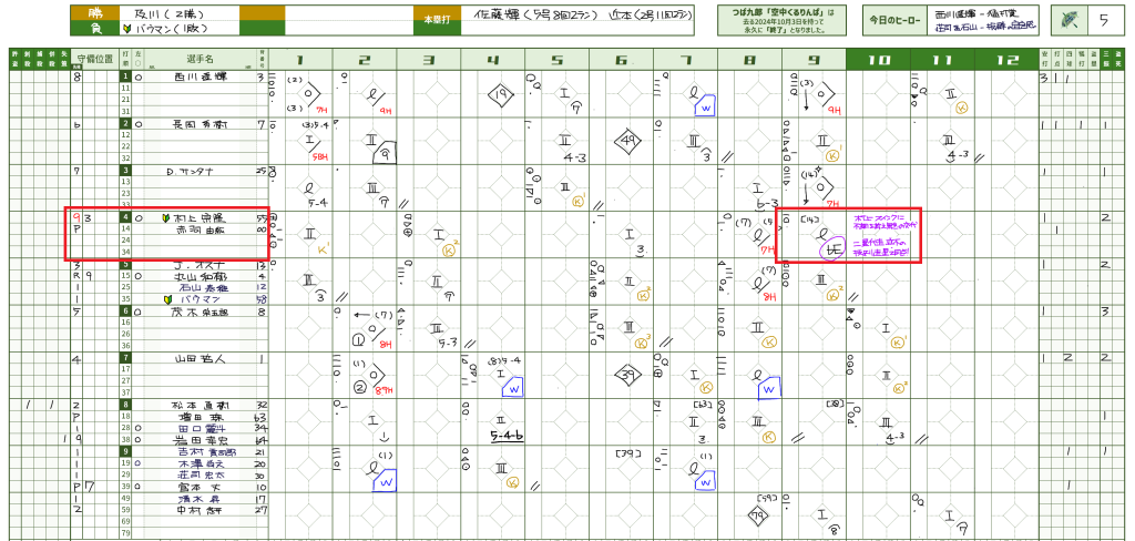 - 9回裏ツーアウト、打席に立った村上選手が1ボール1ストライクの状態でベンチに下がり、赤羽選手が代打として交代。カウントはそのまま引き継がれ、3球目となる投球を打ち、ショートゴロ。