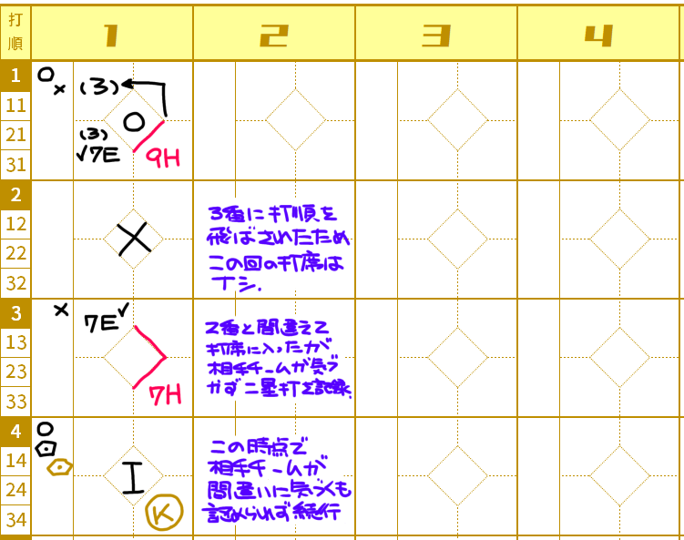 間違いに気づかず試合が進んでしまった場合と、指摘されてアウトになった場合のそれぞれの記載の仕方です。
