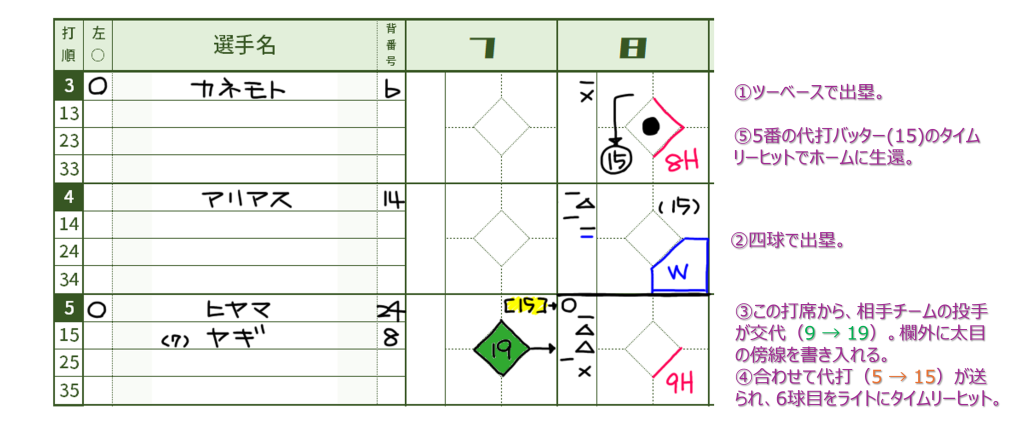 バッターやランナーが代わった時の書き方です。