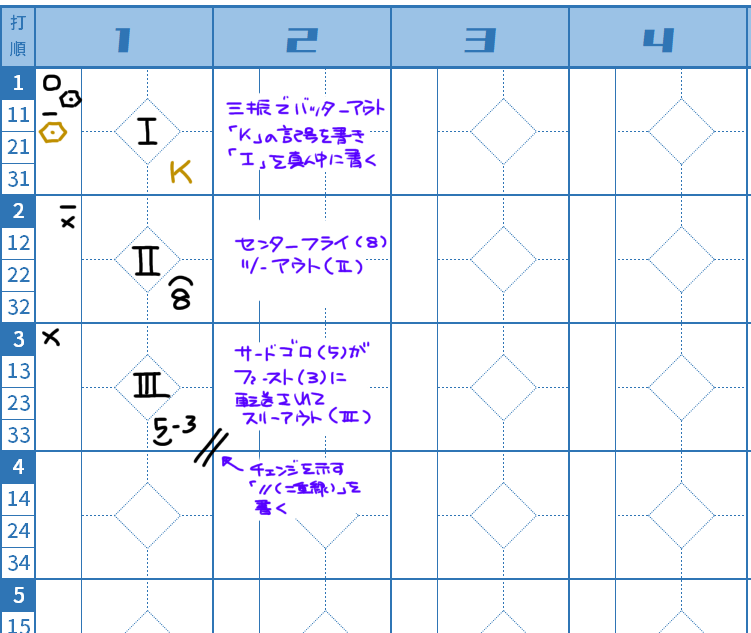 また、アウトになったことを示すアウトカウントの「」「」「」を、アウトカウントのタイミングに合わせて、ひし形の真ん中に書き入れます。また、スリーアウトになった時点で、リザルトの外の右下隅に「//(=二重線)」の記号を書き込み、スリーアウトチェンジになったことが分かるようにします。